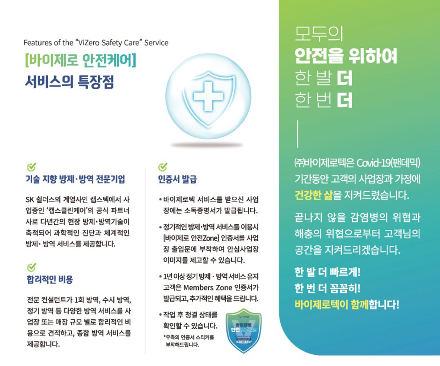 - 바이제로텍의 "바이제로 안전케어” 정기 서비스를 제공받는 사업장에는 “바이제로 안전케어 ZONE” 인증 마크가 부착되어 고객님의 사업장을 찾는 방문객에게 청결한 사업장의 이미지가 전달되어 신뢰와 믿음의 상호 관계 유지에 도움이 될 것입니다.